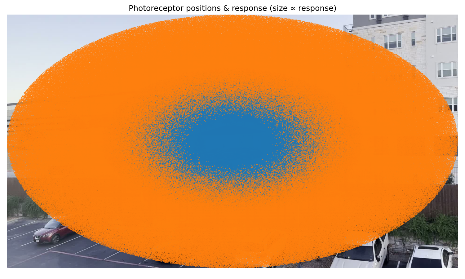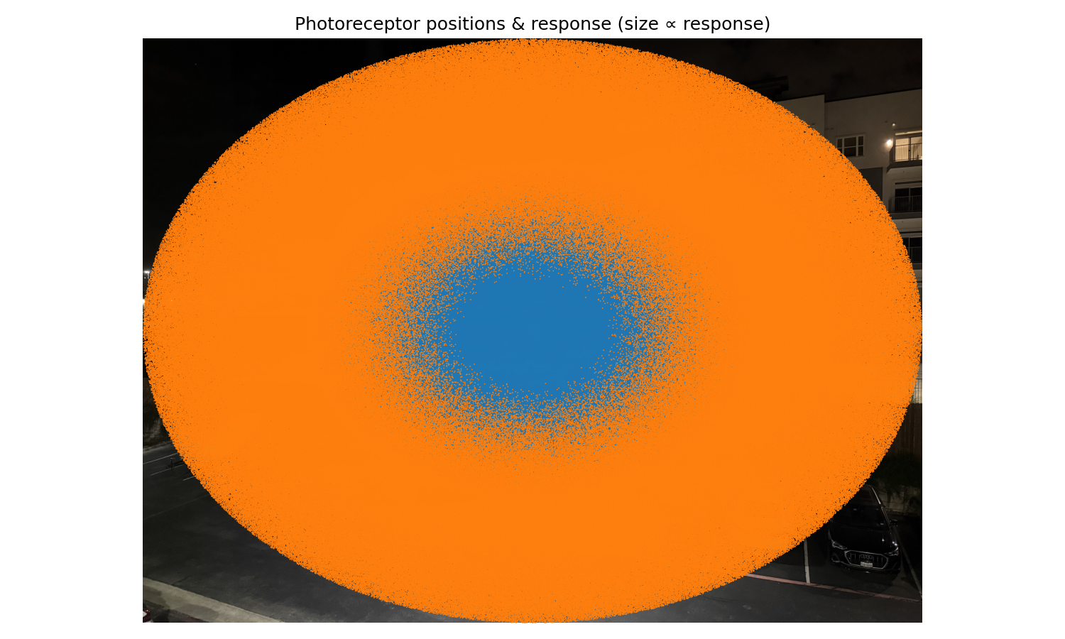 Image with an overlay of the field of vision. Orange dots are rods and blue ones are cones
